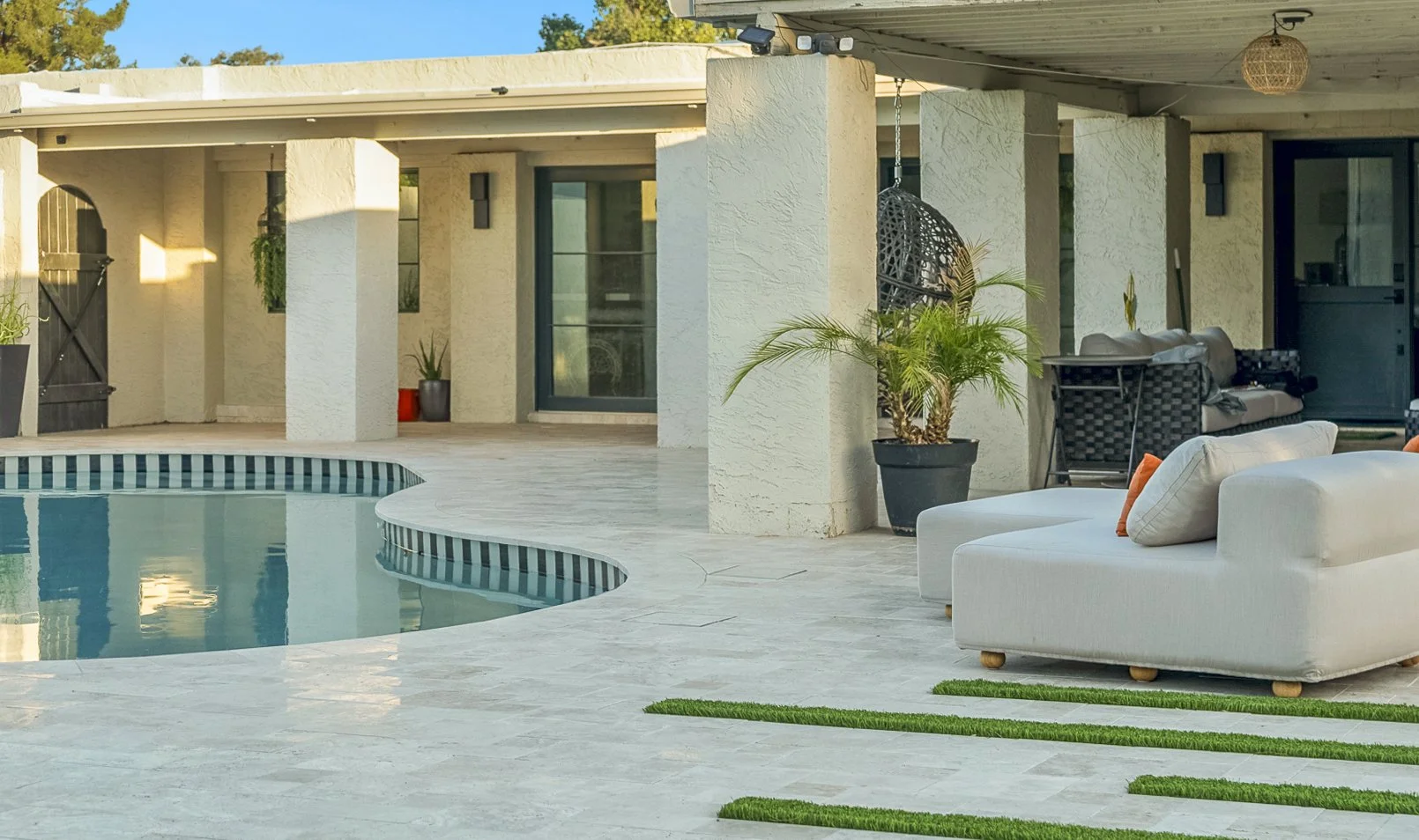 This Scottsdale backyard transformation, nicknamed "Saturday Stripes," features a full pool remodel anchored by bold, custom-striped waterline tile and expansive travertine decking. To maximize entertaining space, we removed an outdated spa and installed precision-cut French-pattern pavers with integrated turf ribbons to carry the "striped" theme throughout the landscape. We utilized a strategic phased approach, preemptively running utility lines for a future outdoor kitchen and accent wall to ensure the yard is ready for its next evolution. The result is a highly unique, modern retreat that balances immediate luxury with long-term functional planning.