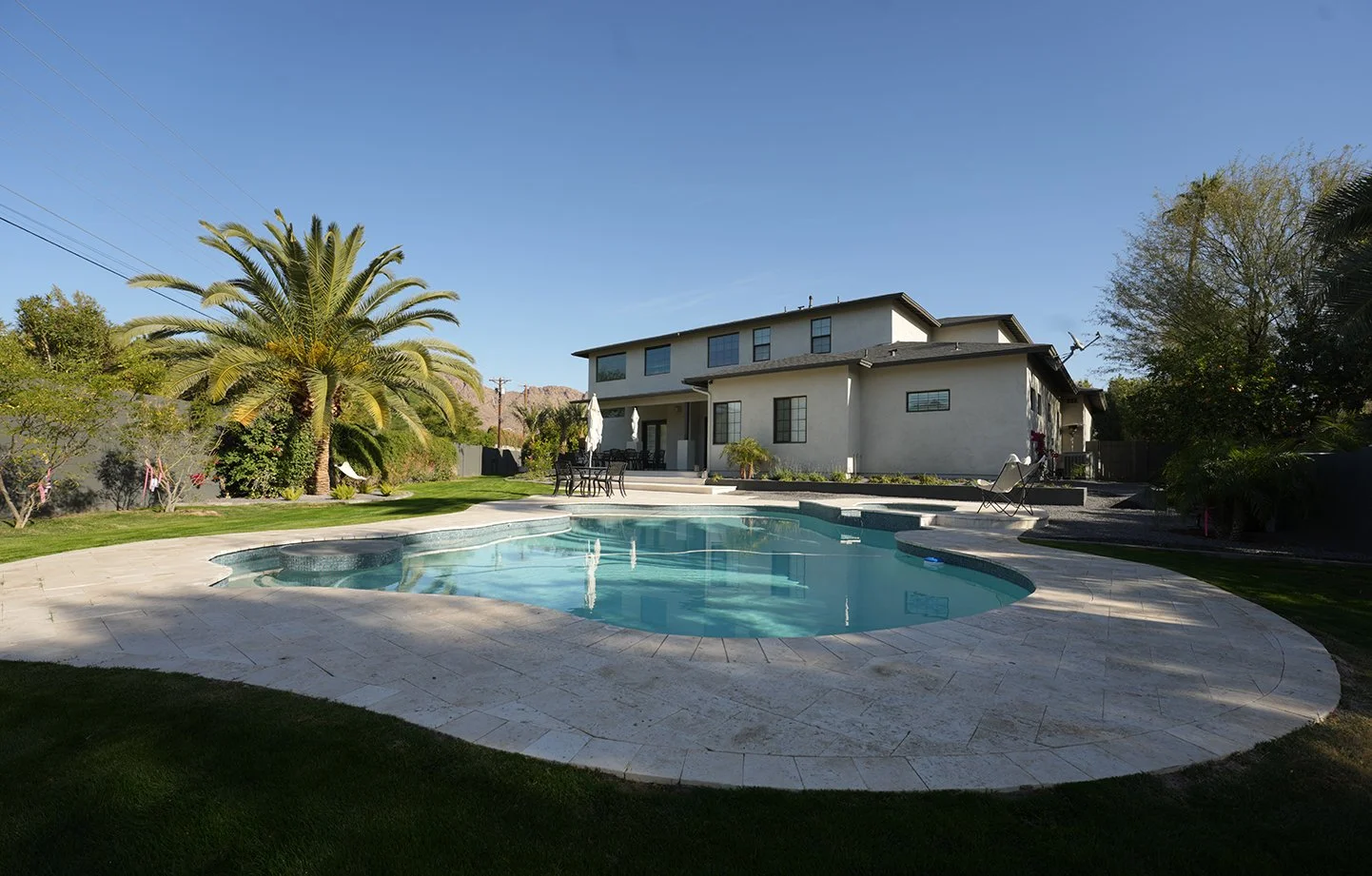 We leveled up this backyard by wrapping a remodeled pool in 2,000 square feet of custom-curved white limestone. To finish the look, we used a 150-foot crane to drop in three massive palms and added 300 new plants for that perfect resort feel.